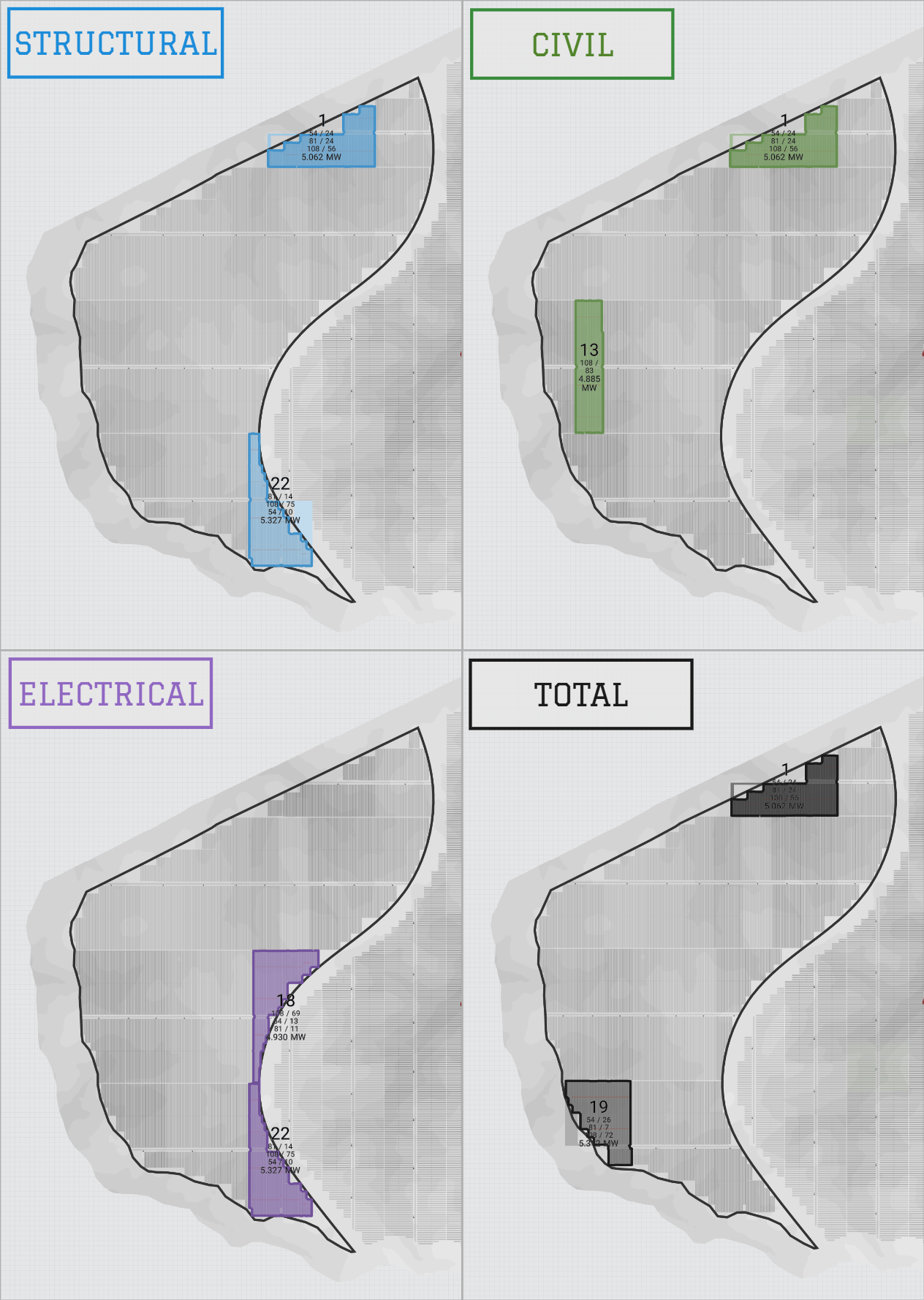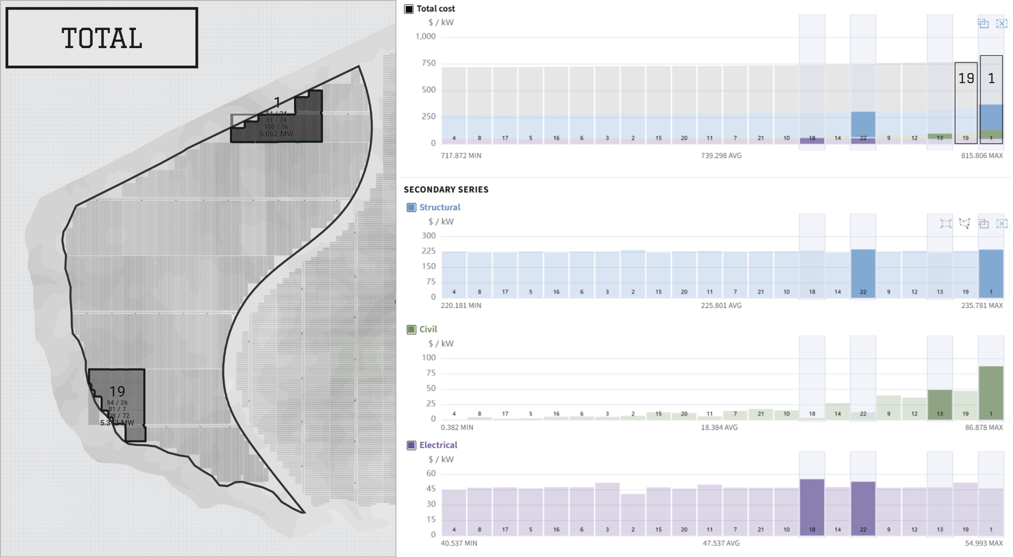 Analyze cost distribution across different spatial levels (Block, Racking). Understand how civil, structural, and electrical components contribute to the total cost: