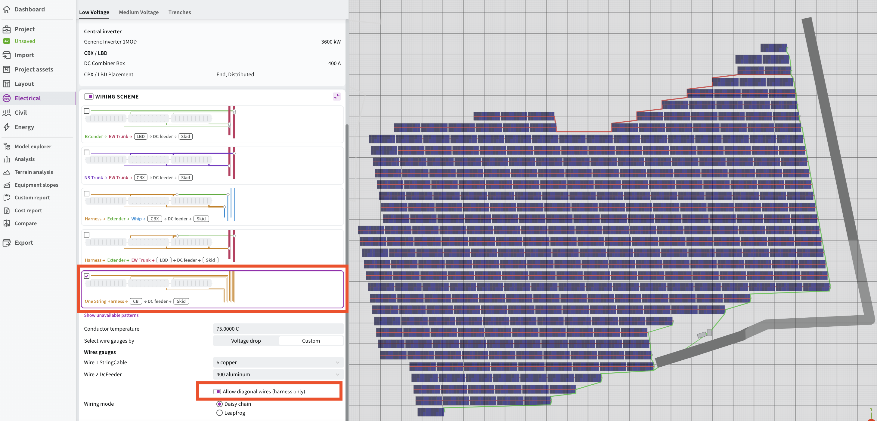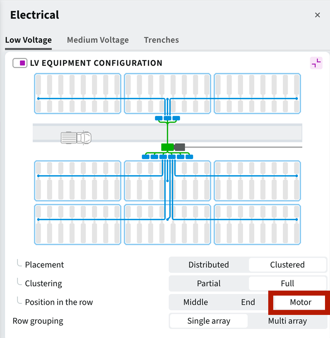- Added an option to route LV cables through the motor gap, assuming trackers are already aligned by motor gaps. On the Electrical → Low Voltage window set the “Combiner Box position in the row” to the “Motor”.