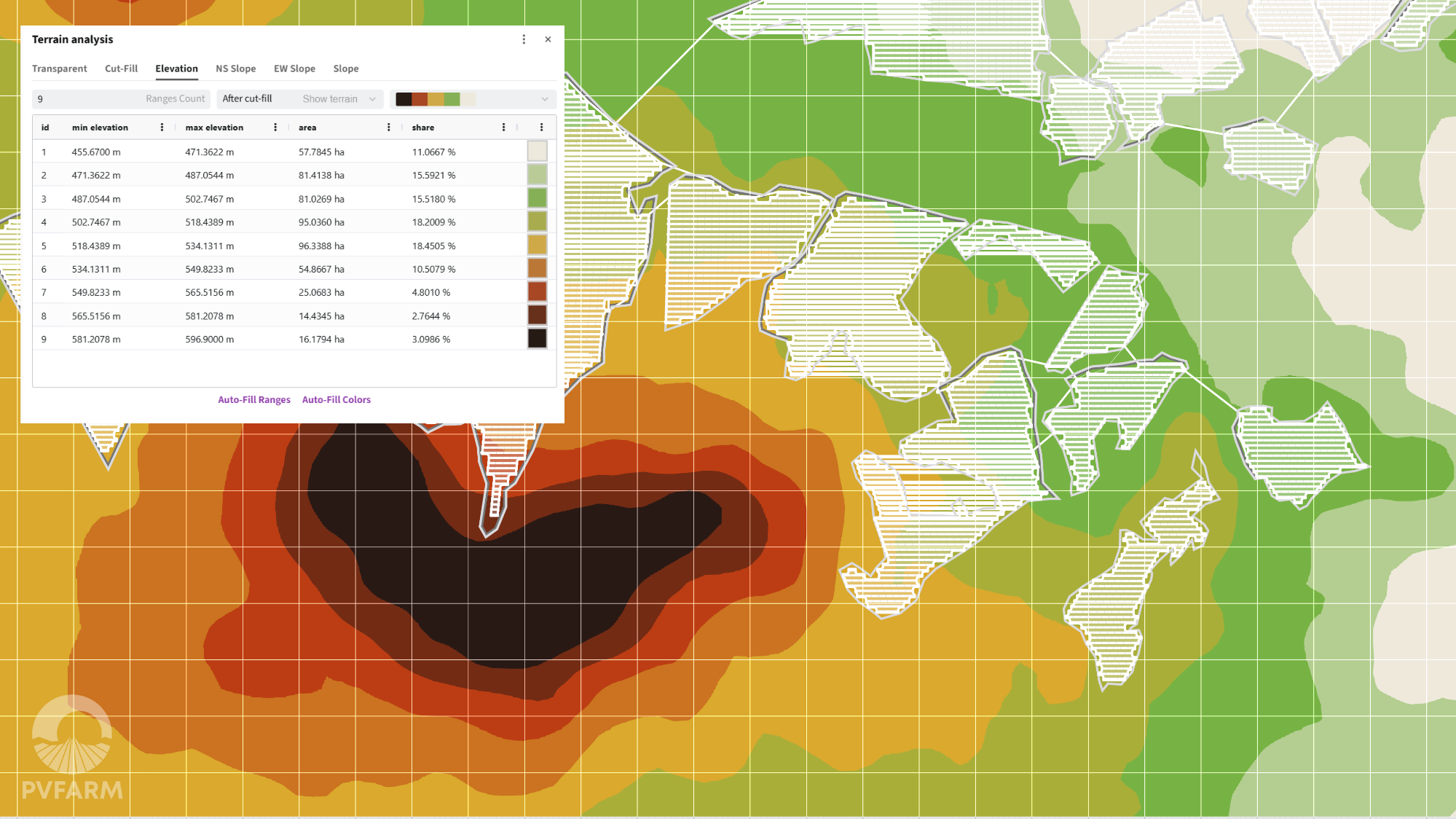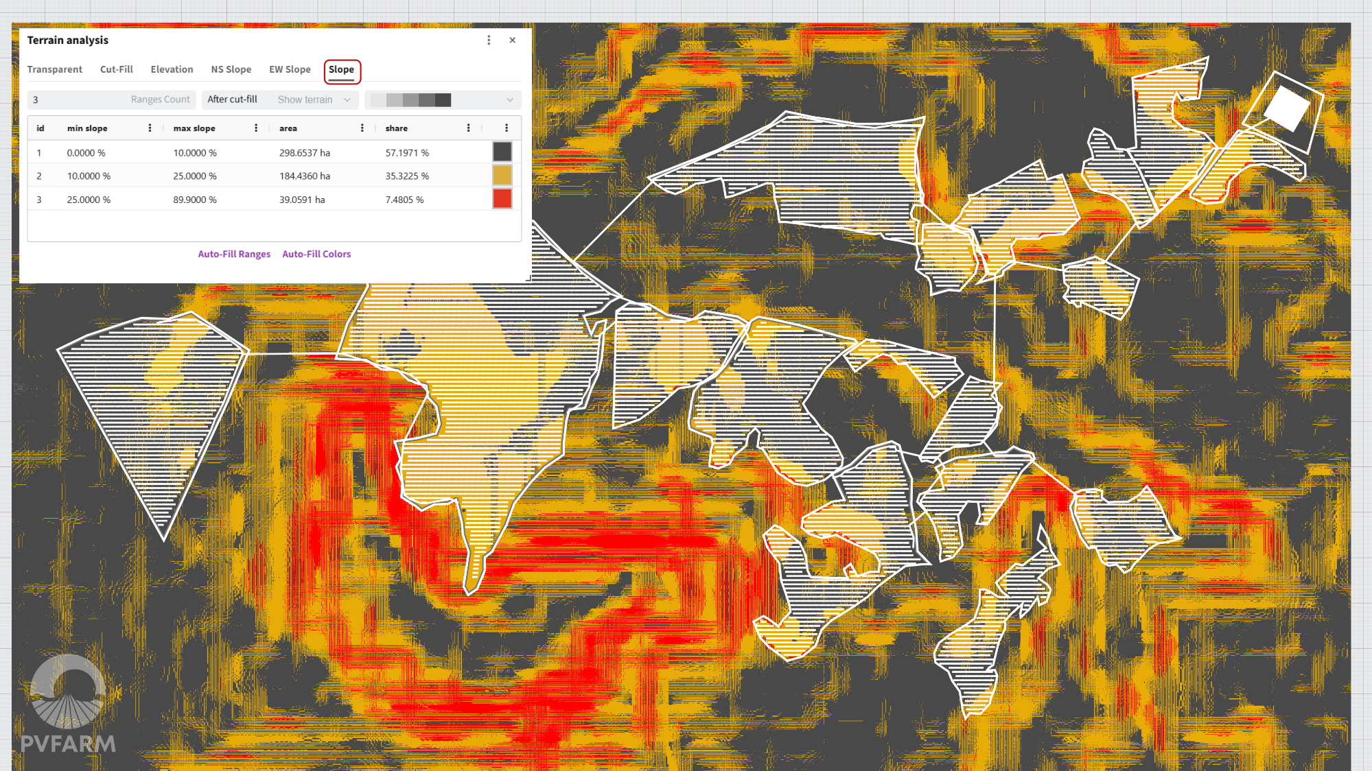 - Terrain slope visualization supports grading and layout evaluation. It is particularly useful for validating Tie Slope after Cut & Fill.